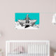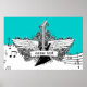 Guitarra branca preta com asas poster impressão, apresentando uma guitarra elétrica, asas, chamas e espirais em pentagrama de música, notas e clave tripla sobre fundo azul-turquesa. Um presente de excelente para um músico, guitarrista ou amante.