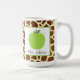 Uma caneca do professor que caracteriza uma ilustração de uma maçã verde dentro de um quadrado branco com guarnição verde. O fundo é impressão do girafa.
