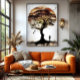 Árvore imponente, suas raízes entrelaçadas como memórias antigas, segredos guardas entre o ouro e as folhas avermelhadas. Uma silhueta humana observa, enquanto os pássaros voam livremente, unindo natureza e alma num abraço poético. Cada pincelada de aquarela é um suspiro de paz, nos lembrando que a vida cresce em raízes e sonhos.