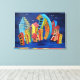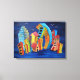 Uma pintura divertida e contemporânea de prédios coloridos flutuando na água. Esta impressão parece excelente como um ponto focal em qualquer casa.