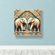Two elephants stand side by side, their trunks intertwined, in front of a stylized tree with orange flowers. The elephants are decorated with similar floral patterns in shades of orange and gold. The background is a mosaic of blue tiles, with an archway above the elephants also adorned with orange flowers and foliage.