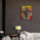A colorful abstract representation of a cityscape with geometric shapes and bold colors. The composition features a mix of structured and chaotic elements