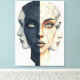 Das Bild ist ein abstraktes geometrisches Porträt mit einem Frauenkopf. Der Kopf ist in zwei Hälften geteilt, wobei die linke Seite dunkelblau und die rechte hellbeige ist. Das Porträt besteht aus verschiedenen geometrischen Formen und Linien, die ein komplexes und kompliziertes Design ergeben. Der Hintergrund hat eine helle Cremefarbe, die mit den dunkleren Tönen des Kopfes kontrastiert. Die Verwendung von Linien und Formen verleiht dem Bild ein modernes und künstlerisches Gefühl und macht es optisch interessant und relevant für diejenigen, die sich für abstrakte Kunst und geometrische Designs interessieren.