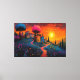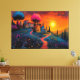 Esta vibrante e fantástica trabalho de arte retrata uma aldeia mágica enfiada numa colina debaixo de um pôr do sol respirável. Lua de cheio ou sol brilhante, calor radiante, domina o céu vermelho e laranja feroz, estudado com estrelas cintilantes. Um trajeto curvo e curvo percorre um motim de flores silvestres coloridas e gramíneas em tons de azul, roxo e rosa. Casas tradicionais com janelas brilhantes pontilham a paisagem, levando a um aglomerado de casas na crista. Árvores de cores impressionantes, incluindo um azul elétrico proeminente e uma fúcsia vívida, somam-se à atmosfera cômica e surreal desta cena de sonho.