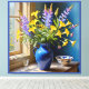 Arte Buquê Amarelo Azul Púrpura Capture tranquilidade com esta serena e estilizada aquarela, vida morta de flores em um vaso com delicadas flores em blues, amarelos e roxas. Perfeito para arte de parede e cartões de saudação.