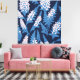 Arte emoldurada com flores azuis e brancas sobre fundo escuro.