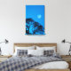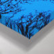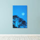 Árvores escuras silenciadas contra um céu azul com uma lua de cheio.