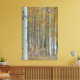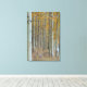 Um pomar denso de aspir preenche a armação, seu latido suave e branco contrastando fortemente com as folhas amarelas vibrantes que ainda se agarram aos galhos. As árvores ficam altas e esbeltas, criando um sentido de profundidade e perspectiva. O chão é coberto por uma camada de folhas caídas e grama seca, adicionando um toque de calor à cena.