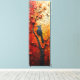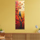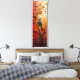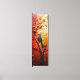 Esta imagem apresenta uma canvas vertical com uma pintura texturizada que retrata uma árvore no meio do outono. As folhas são renderizadas em tons quentes de vermelho, laranja e amarelo, sugerindo a mudança de cores durante a temporada de outono. O fundo é neutro, permitindo que as cores vibrantes das folhas se destacem de forma destacada. A textura aparece elevada e palpável, adicionando profundidade e dimensão ao trabalho de arte.