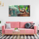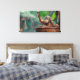 O bebê Orangutan senta-se numa pequena bacia natural de madeira cheia de água, rodeada por um enxuto verde na chuva