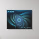 Uma imagem fractal azul parecida com um grupo giratório de baleias sob gelo polar; talvez beluga ou baleias-da-índia que frequentam os polos. Leitura de texto, "Alaska" também aparece em azul e branco brilhantes. Personalize adicionando seu próprio texto adicional.