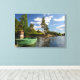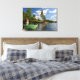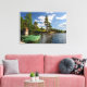 impressão de paisagem de canvas de um pequeno barco verde e de uma cabana de madeira com algumas árvores altas à beira da água numa paisagem de fiorde em Byglandsfjord, Noruega.