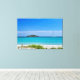 Uma bela tela com uma fotografia original da água azul clara e da praia de areia branca do mar esmeralda em Corse (França) com todos os seus tons de turquesa, cercada por um esfregão verde mediterrânico com uma pequena ilha e alguns barcos à vela à distância num dia ensolarado de verão, sob um céu azul claro.