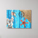 Uma textura de fundo rústica de madeira azul, burlap faux, starfish laranja, concha, coral branco e bússola posicionados no centro. Um design náutico com um toque moderno.
