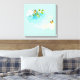 Um fundo abstrato com círculos e formas irregulares. A cor é um verde-primavera, turquesa e amarelo-acastanhado em cores claras e pastéis. Um casal de borboletas laranja e amarelas pairando em torno de algumas flores delicadas, floridas, com folhas verdes e ramos marrons. Tem uma aparência nova, encantadora, mágica.