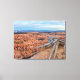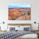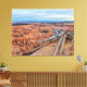 Uma visão panorâmica do Parque Nacional do Bryce Canyon, em Utah, mostrando os hoodoos icônicos, torcendo formações rochosas vermelhas que sobem do chão do canyon. A imagem capta uma vasta extensão do cânion, com um tronco de árvore branco-branqueado e curvado no primeiro plano, suas ramificações se estendendo para o espectador. O céu é azul macio com nuvens espertas, acrescentando um senso de tranquilidade à cena.