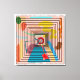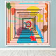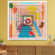 Um padrão geométrico vibrante e colorido, com quadrados concêntricos centrados, desenhar o olho para dentro, rodeado por várias formas de abstrato em tons brilhantes. Uma seta direcionada aponta para o ponto focal, acrescentando um sentido de direção e movimento.