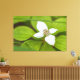 Uma fotografia de proximidade mostra uma delicada flor de baga de cachos com quatro pétalas, cercada por folhas verdes vibrantes. O centro da flor apresenta um aglomerado de pequenas sementes de cor escura. As folhas são lisas e arredondadas, criando um pano de fundo exuberante para a flor. A imagem está bem iluminada, destacando as texturas e as cores da flora. Uma lâmina de grama é visível no primeiro plano.