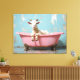 Uma pintura branca com uma cabra branca com chifres relaxando numa banheira rosa vintage, colocada contra uma parede azul clara para uma encantadora e divertida cena rústica.