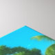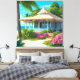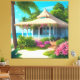 Uma casa de praia com o oceano vê flores tropicais coloridas, palmeiras, e um gato amarelo dormindo na varanda.