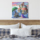 Se você ama as sereias, então esta pintura é para você. O Castelo de Sereia pintado por Traci Van Wagoner apresenta uma sereia com cabelo roxo na frente e uma sereia com cabelo verde se soltando em ilhas rock enquanto outra sereia com natações de cabelo cor-de-rosa no oceano diante de um castelo com um céu roxo, laranja e amarelo por trás. Esta bela e caprichosa arte da fantasia faz um presente de excelente e uma decoração espantosa para o seu escritório ou casa.