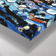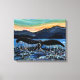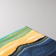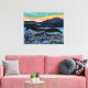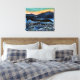 Uma pintura da cauda de uma baleia acima das ondas no pôr do sol.