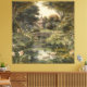 pintura em vintage de uma cena botânica de cisnes nadando na água em um jardim inglês com lírios, pontes e muitas flores exóticas
