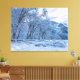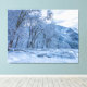 A imagem captura uma cena serena de inverno com um primeiro plano de árvores e galhos cobertos de neve. As árvores são negras, seus ramos carregados de neve fresca, criando um padrão delicado e intrincado. O chão é manchado em neve branca pristina, com galhos caídos adicionando um toque de textura.