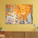 Uma imagem vibrante captura a beleza do outono num cenário urbano. Um galho carregado com folhas de ouro amarelo domina o primeiro plano, criando um quadro natural para a cena. As folhas, com suas intrincadas veias e formas delicadas, contrastam lindamente com o pano de fundo de uma rua urbana.