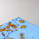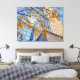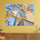 Um tiro de baixo ângulo captura uma vibrante cena do outono com um galho de árvore carregado com folhas amarelas brilhantes no primeiro plano. Os galhos armam um arranha-céu em torre com um design moderno e geométrico. A fachada de vidro do prédio reflete o céu azul e a paisagem urbana circundante, criando uma sensação de vibração urbana.