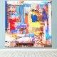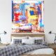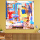Traços negros de azuis vibrantes, vermelhos e amarelos se misturam com tons de terra para criar uma composição dinâmica e energética. Os padrões e salpicos abstrato trazem à peça um sentido de movimento e espontaneidade.