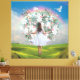 Arte de Muro de Colagem Moderna. Esta é a parte de trás de uma garota com um vestido branco com grande buquê floral e morango contra um dramático céu turvo com pomba. Flores macias, brancas, pinças e vermelhas. Divertido, mod e efemémia eclética. Esta é uma superfície plana com um acabamento de canvas liso. Arte divertida e surreal usando uma mistura de técnicas de colagem e arte digital, com uma sensação retrorreflectora vintage, do século médio.