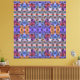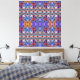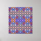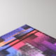 Um padrão geométrico complexo apresenta tons vibrantes de púrpura, azul, laranja e rosa, colocados sobre um fundo de cinza. O design cria um efeito simétrico, visualmente dinâmico.