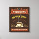 Esta decoração retangular de parede de canvas com o tema do café é para qualquer pessoa que comanda seu próprio compro de café ou tenha um tema de café em sua decoração de cozinha doméstica. Feito em castanho, laranja, bege e amarelo, este design de inspiração/espresso apresenta uma xícara em um disco, duas banners de texto personalizados e as palavras "Compro de café / Floresta fresca / Sabor de Excelente" em amarelo. A caneca está a vapor e a faixa de cima tem espirais que imitam a fumaça. Tudo repousa sobre um fundo escuro de grãos de café. Use as modelos para adicionar seu nome facilmente. Você também pode mudar o slogan inferior se quiser, que atualmente lê, "Sem Motivos para Reclamação." Se precisar redimensionar o texto para o ajustado, clique em "Personalizar." Pegue uma xícara de Joe e admire sua própria arte personalizada de café.