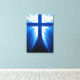 Silhueta de crucifixo de cristo sobre fundo azul com raios de luz do fundo. Cristianismo, religião, símbolo páscoa de ressurreição.