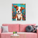 Arte aérea branca adorável com um cachorrinho castanho e branco rodeado por flores de arte folclórica, cor-de-rosa, laranja e roxo.