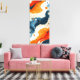 The artwork maintains an energetic, spontaneous feel through the use of numerous paint splatters and droplets in black, white, and color accents. The overall impression is one of fiery energy meeting cool depths, making it an impactful and modern design choice for contemporary interiors.