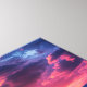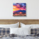 Um pôr do sol que respira lança um brilho quente sobre uma vasta paisagem do deserto. A imagem mostra uma majestosa ascensão de montanha das dunas arenosas. O céu está em chamas com cores vibrantes de laranja, rosa e roxo, criando um contraste dramático com a areia ouro. As dunas rolantes se esticam até a distância, criando uma sensação de vastidão e solidão.
