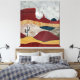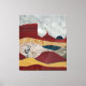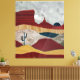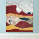 Uma paisagem abstrato com cores e texturas únicas mostrando uma cena do deserto com um sol azul ascensão e um cacto em tons de vermelho, cinza, bege e azul.