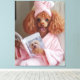 Uma imagem hiperrealista de um charmoso poodle relaxando em um roupão rosa com uma toalha correspondente envolta em sua cabeça. O adorável cão está confortavelmente sentado numa cadeira, segurando uma revista com outro poodle no cobrir. A sua expressão divertida e a sua definição luxuosa do tipo spa tornam esta cena simultaneamente fofa e divertida.