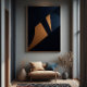 An abstract composition defined by angular shapes and diagonal layers that create a dynamic visual flow. Deep blue tones blend with soft golden accents, resulting in a sophisticated and modern artwork, ideal for spaces that value elegance and contemporary design.