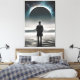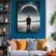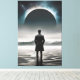 A solitary man contemplates a colossal solar eclipse, immersed in a melancholic coastal landscape. The image evokes reflections on the vastness of the universe and human insignificance.