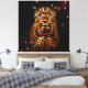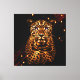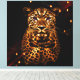 Eclipse Majestade, mostre um leopardo com pele de ouro brilhante e manchas distintas, colocado sobre um fundo escuro. Os olhos do leopardo estão iluminados em roxo brilhante, criando um efeito marcante e místico. Os arredores escuros são acentuados por luzes espalhadas e quentes, dando à cena uma atmosfera dramática quase de outro mundo.
