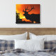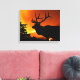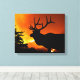 Um alce fica em cima de uma colina como um incêndio selvagem se estende atrás dele. A silhueta dele se destaca nitidamente contra o fogo no fundo.