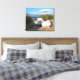 Um design fotográfico de barcos nas dunas de areia e barcos distantes amarrados no porto. País de Gales, Reino Unido.