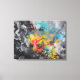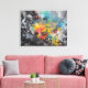 pintura de abstrato em muitas cores. Os azuis, amarelos e vermelhos dessa pintura imaginativa são colocados num fundo de preto, branco e cinzas. Esta pintura acrílica parece induzir sentimentos de felicidade e entusiasmo.