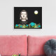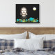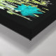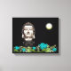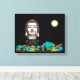 Uma estátua de cabeça prateada de Buda, refletindo sobre a água preta cheia de flores de turquesa lotus flutuantes e almofadas de lírios verdes. Fundo preto.