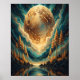 Esta obra de arte digital retrata uma cena surreal e encantadora, onde um planeta texturizado e massivo domina o céu, lançando um brilho quente e dourado sobre uma paisagem florestal tranquila. O planeta, com seus padrões intricados na superfície, parece flutuar sobre um lago calmo, refletindo sua luz e cores na água abaixo. Pinheiros altos se erguem em margens rochosas, suas silhuetas adicionando profundidade à composição. O céu está repleto de padrões giratórios de azul-turquesa, dourado e azul profundo, criando uma sensação de movimento e energia. A interação de luz e sombra, combinada com a superfície reflexiva do lago, evoca uma sensação de maravilha, paz e beleza do cosmos. Esta imagem captura a harmonia entre a natureza e o universo, convidando os espectadores a contemplar a vastidão e o mistério do cosmos.