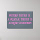 Em texto cor-de-rosa lê-se: "Onde há uma Mulher, há Realização." Os O's na citação são, na verdade, o sinal para a Mulher.