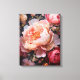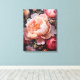 Uma vívida aproximação de peões e rosas florescentes, apresentando pétalas suaves e fluentes em tons de rosa, pêssego e branco contra um fundo escuro. Este belo trabalho de arte floral traz vida e elegância a qualquer quarto.